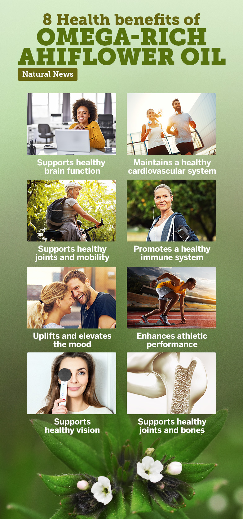 Other plant-based oils, such as flax, chia, and hemp seed oils, only contain alpha-linolenic acid (ALA), a type of omega-3 fatty acid that can be used as an energy source for your body. Around three to six percent of the ALA you consume is converted into docosahexaenoic acid (DHA) and eicosapentaenoic acid (EPA), which are fatty acids that support the healthy functioning of your brain, immune, nervous, and cardiovascular systems. In comparison, ahiflower oil contains stearidonic acid (SDA), which is more readily and more efficiently converted into DHA and EPA. Up to 30 percent of the SDA you consume can be converted into DHA and EPA. A study also revealed that EPA conversion is 4x more efficient with ahiflower oil than with flaxseed oil. (Related: Ahiflower: The richest non-fish source of omega fatty acids on the planet.)